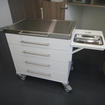 auszug sowie eine ausklappbare Ablagefläche mit Öffnungen für Instrumentenschale und Spritzenabwurf. Die Hauptablagefläche ist mit Edelstahl versehen.